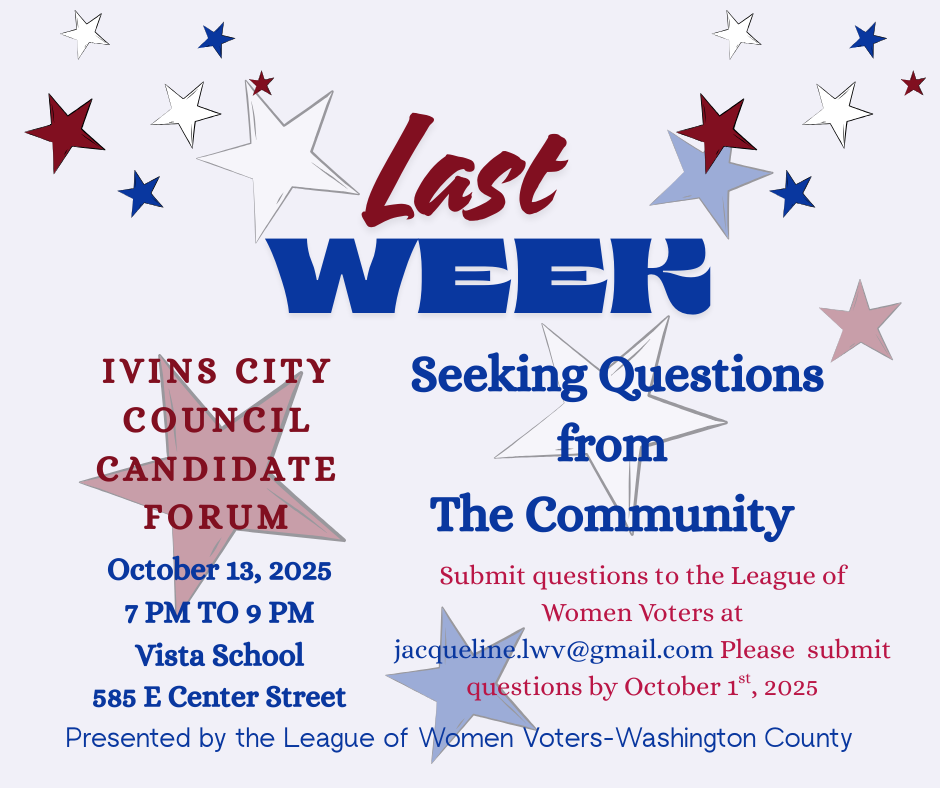 Appropriation for expansion of Cove Reservoir was to be removed from state budget. Conserve Southwest Utah and LWV helped save appropriation for now.
